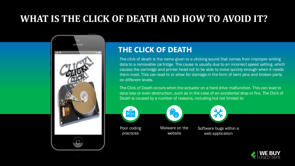 The term “Click of Death” refers to a design flaw in the hard drive that can cause data loss when users try to read from or write on their drives. The name was coined because it’s possible for user error and hackers, who may not have known about this particular problem previously, could damage your computer by clicking too many times while inserting removable disc media.
