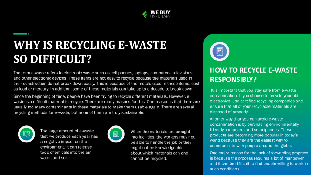 Recycling electronic waste is difficult because it requires a lot of effort. When the materials are brought into facilities, the workers may not be able to handle the job or they might not be knowledgeable about which materials can and cannot be recycled.